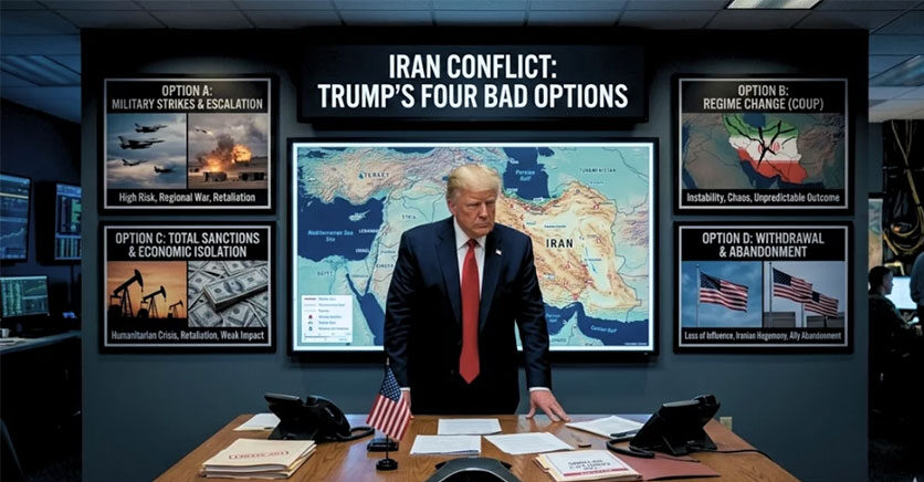 চতুর্থ সপ্তাহে পদার্পণ করা এই যুদ্ধে ট্রাম্পের সামনে এখন চারটি প্রধান পথ খোলা রয়েছে—আলোচনা করা, সামরিক বিজয় ঘোষণা করে সরে আসা, বর্তমান পরিস্থিতি বজায় রাখা অথবা সংঘাতের তীব্রতা বাড়ানো। তবে বিশ্লেষকদের মতে, এই বিকল্পগুলোর প্রতিটিই অত্যন্ত ঝুঁকিপূর্ণ এবং কোনোটিই যুদ্ধের সুনিশ্চিত ও সন্তোষজনক সমাপ্তির গ্যারান্টি দেয় না।
