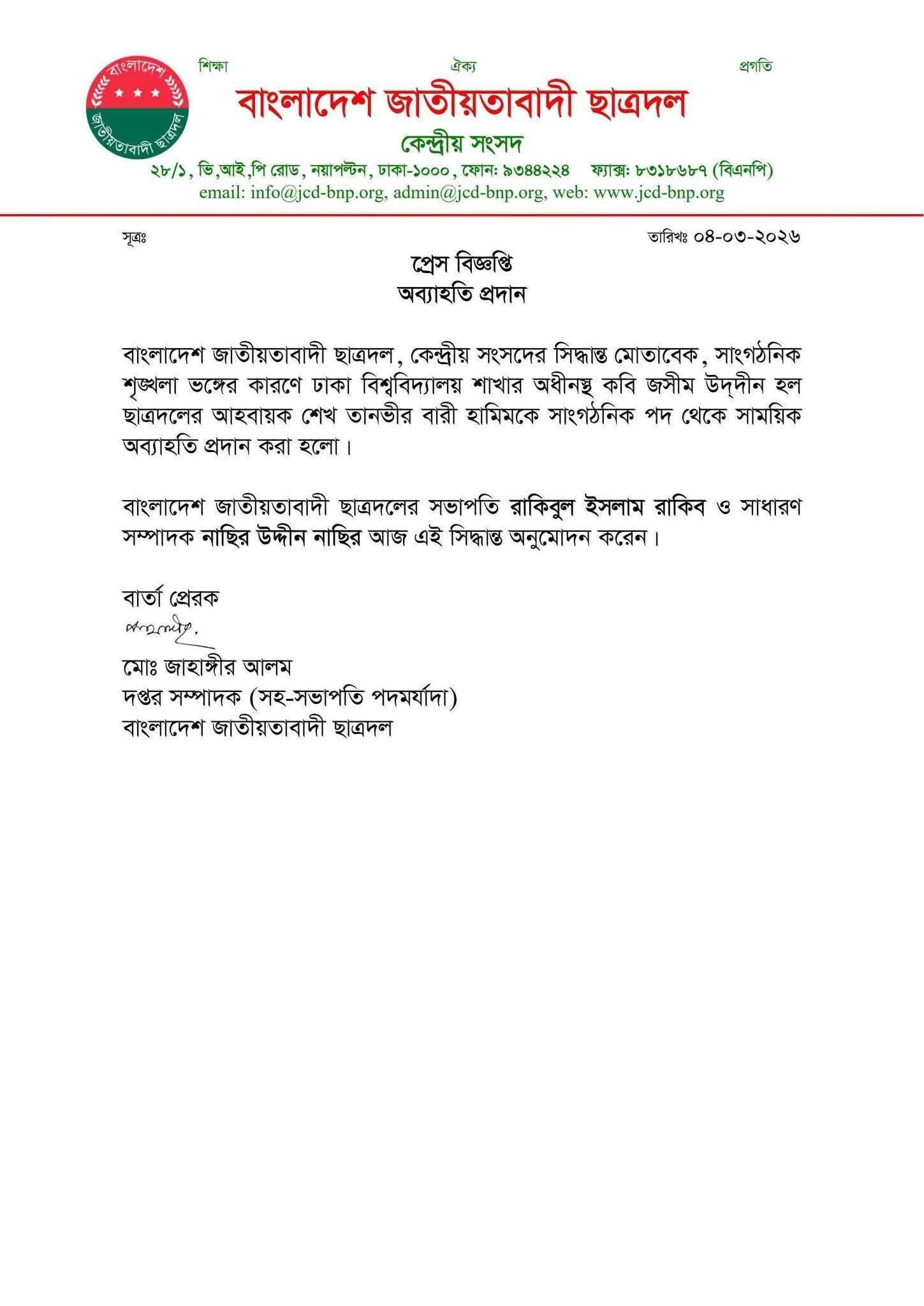 বুধবার (৪ মার্চ) সংগঠনের এক বিজ্ঞপ্তিতে এ তথ্য জানানো হয়। বিজ্ঞপ্তিতে বলা হয়, সাংগঠনিক শৃঙ্খলা ভঙ্গের অভিযোগে কেন্দ্রীয় সংসদের সিদ্ধান্ত অনুযায়ী তাকে এ পদ থেকে সাময়িক অব্যাহতি প্রদান করা হয়েছে।