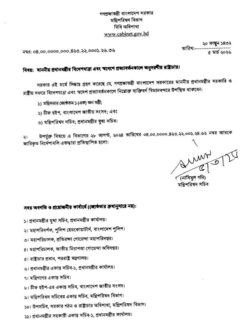 বিধিমালায় বলা হয়েছে, সরকার প্রধানের সফরকালীন বিদায় ও অভ্যর্থনা অনুষ্ঠানে উপস্থিত থাকবেন—জ্যেষ্ঠতম একজন মন্ত্রী, জাতীয় সংসদের চিফ হুইপ, মন্ত্রিপরিষদ সচিব এবং প্রধানমন্ত্রীর মুখ্য সচিব। এর বাইরে অন্য কোনো মন্ত্রী, প্রতিমন্ত্রী বা সরকারি কর্মকর্তার উপস্থিতি নিরুৎসাহিত করা হয়েছে।