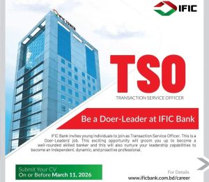 আইএফআইসি ব্যাংক পিএলসি নতুন জনবল নিয়োগের বিজ্ঞপ্তি প্রকাশ করেছে। প্রতিষ্ঠানটি ‘ট্রানজেকশন সার্ভিস অফিসার (টিএসও)’ পদে একাধিক প্রার্থী নিয়োগ দেবে। আগ্রহী…